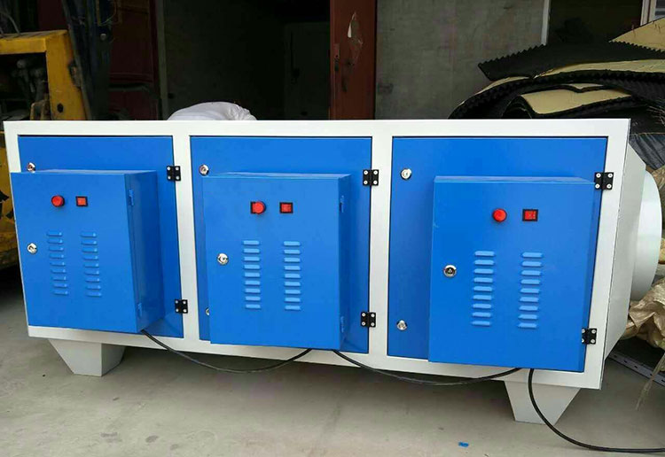 等離子凈化設備內部裝有獨特的碰吸單元,截留去除廢氣中的顆粒物質,廢氣收集系統收集的多元素氣體經過等離子活性氧凈化裝置,在高壓等離子電場的作用下,電離初始態氧將其中的廢氣離子進行電離荷電凈化,帶電的微小離子(塵埃粒子)被吸附單元所收集并流入和沉積到氣體處理裝置的儲塵箱內,氣體內的有害氣體被電場內所產生的臭氧所殺菌,并去除了異味,有害氣體被除掉,達到廢氣處理的目的。